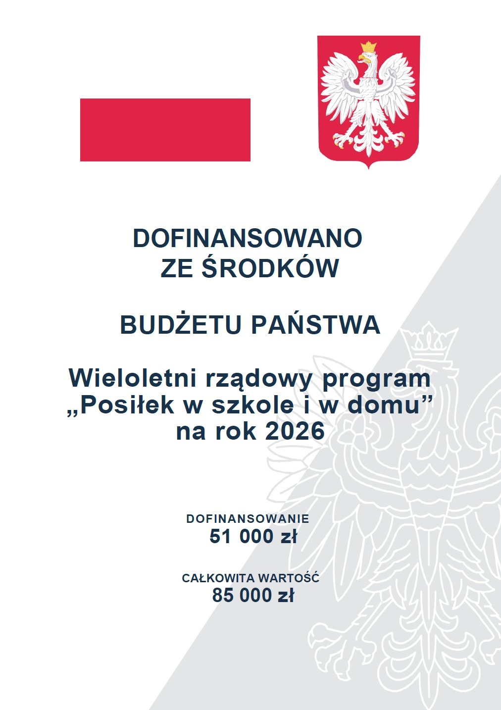 Łączny koszt programu „Posiłek w szkole w domu w roku 2026 r. wynosi 85 000 zł.